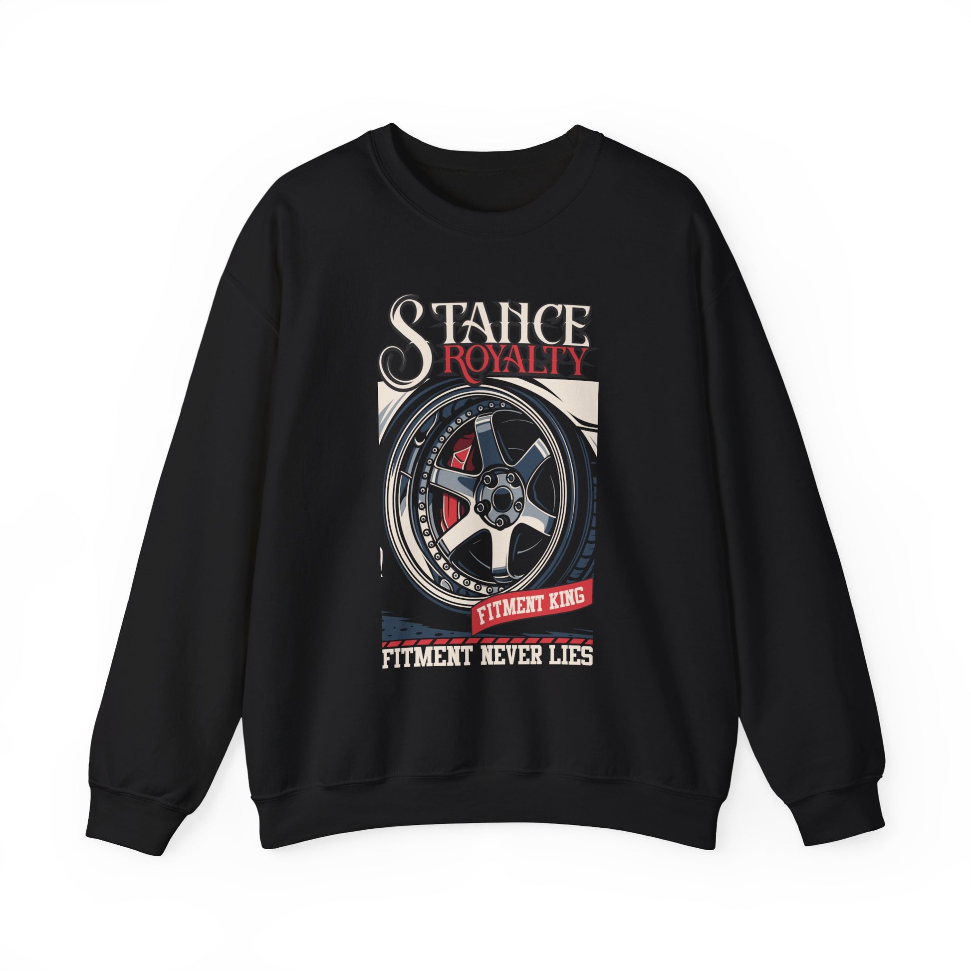 This crewneck sweatshirt carries the spirit of car culture — low, loud, and proudly detailed. A bold wheel graphic and vintage racing type sit against a deep black knit, announcing membership in the stance community without shouting. The medium-heavy 50/50 cotton-poly fabric feels substantial and breaks in just right, while ribbed cuffs and waistband hold shape through repeated drives and washes. Wear it to meets, late-night garage sessions, or weekend cruises; it settles into the rhythm of shop lights, pavement, and conversation about offsets and camber. The embroidered and printed options let you personalize placement, and the tear-away label keeps the neck comfortable for long days behind the wheel.